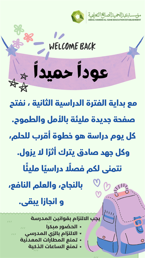 بمزيدٍ من التفاؤل نرحّب ونهنئ ببداية الفصل الدراسي الثاني، سائلين الله أن يجعله فصلًا مليئًا بالخير والإنجاز.