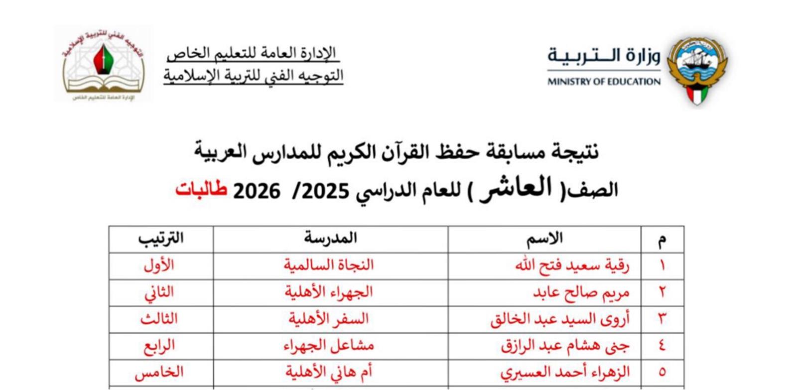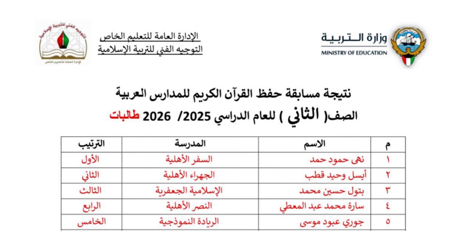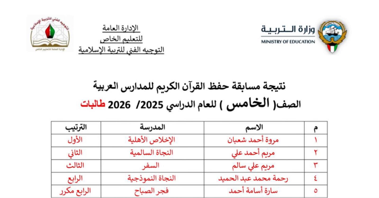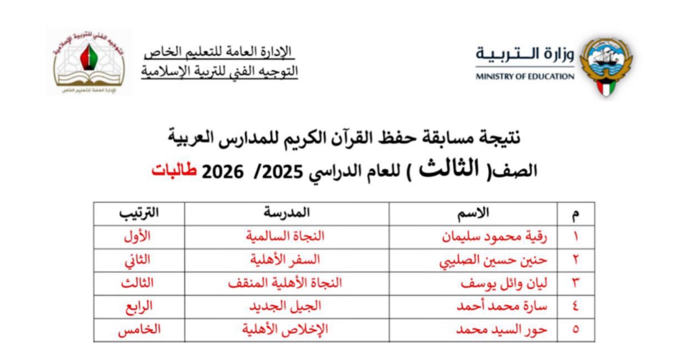 بكل فخر واعتزاز، نُعلن نتائج مسابقة حفظ القرآن الكريم للمدارس العربية للعام الدراسي 2025/2026، والتي أُقيمت بإشراف التوجيه الفني للتربية الإسلامية بوزارة التربية، وشملت طالبات الصفوف من الأول الابتدائي وحتى الثاني عشر.