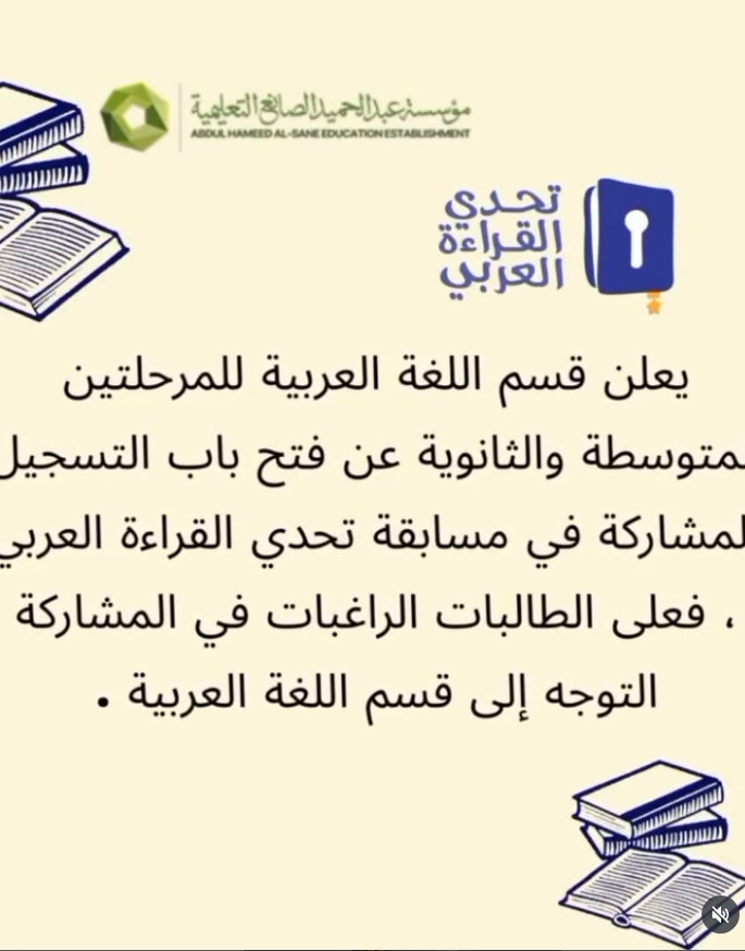 طالباتنا المبدعات النجيبات يدعوكم قسم اللغة العربية للمرحلتين ( المتوسطة والثانوية) لخوض أروع مغامرة فكريةالمشاركة في مسابقة تحدي القراءة العربي