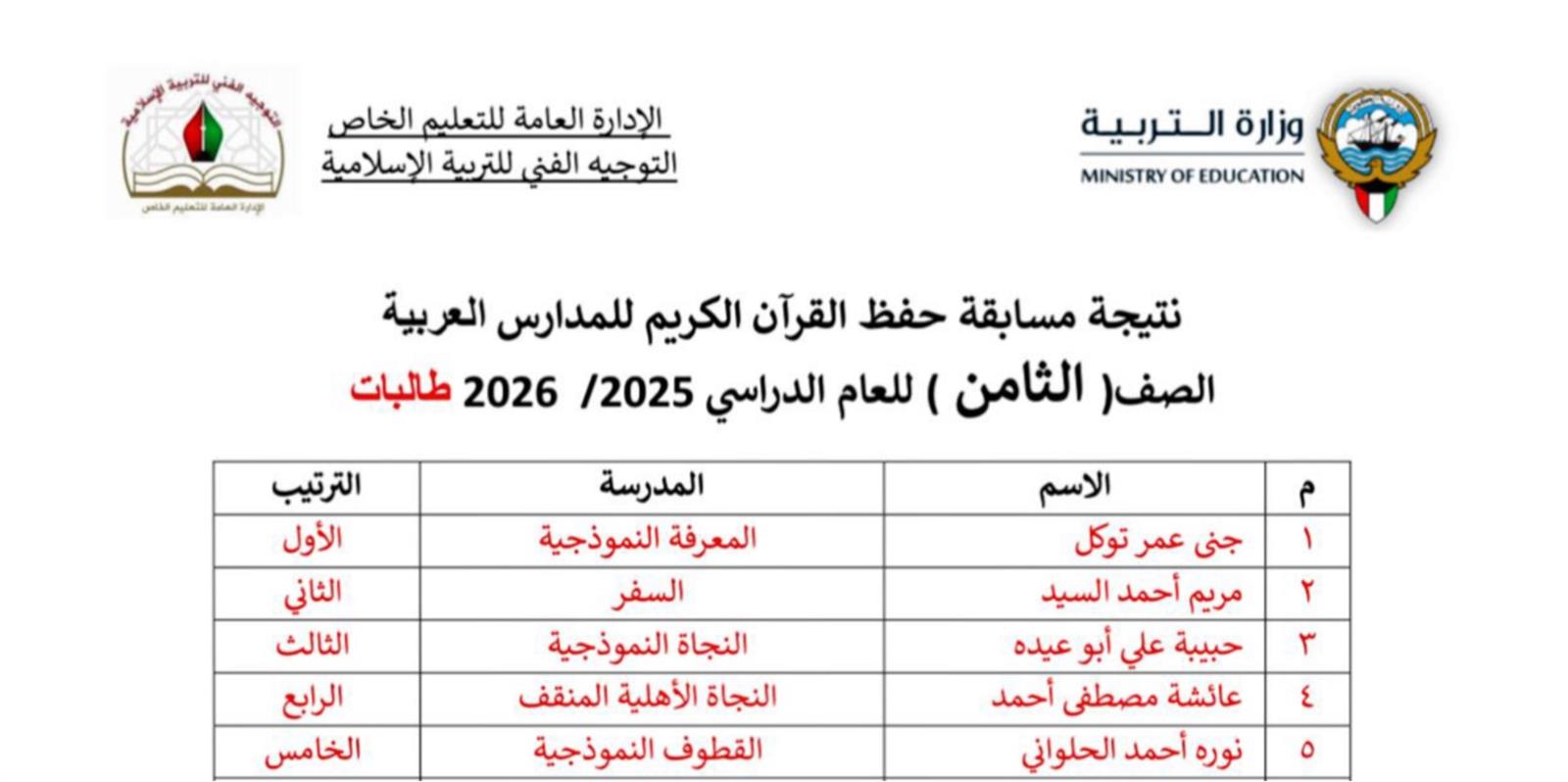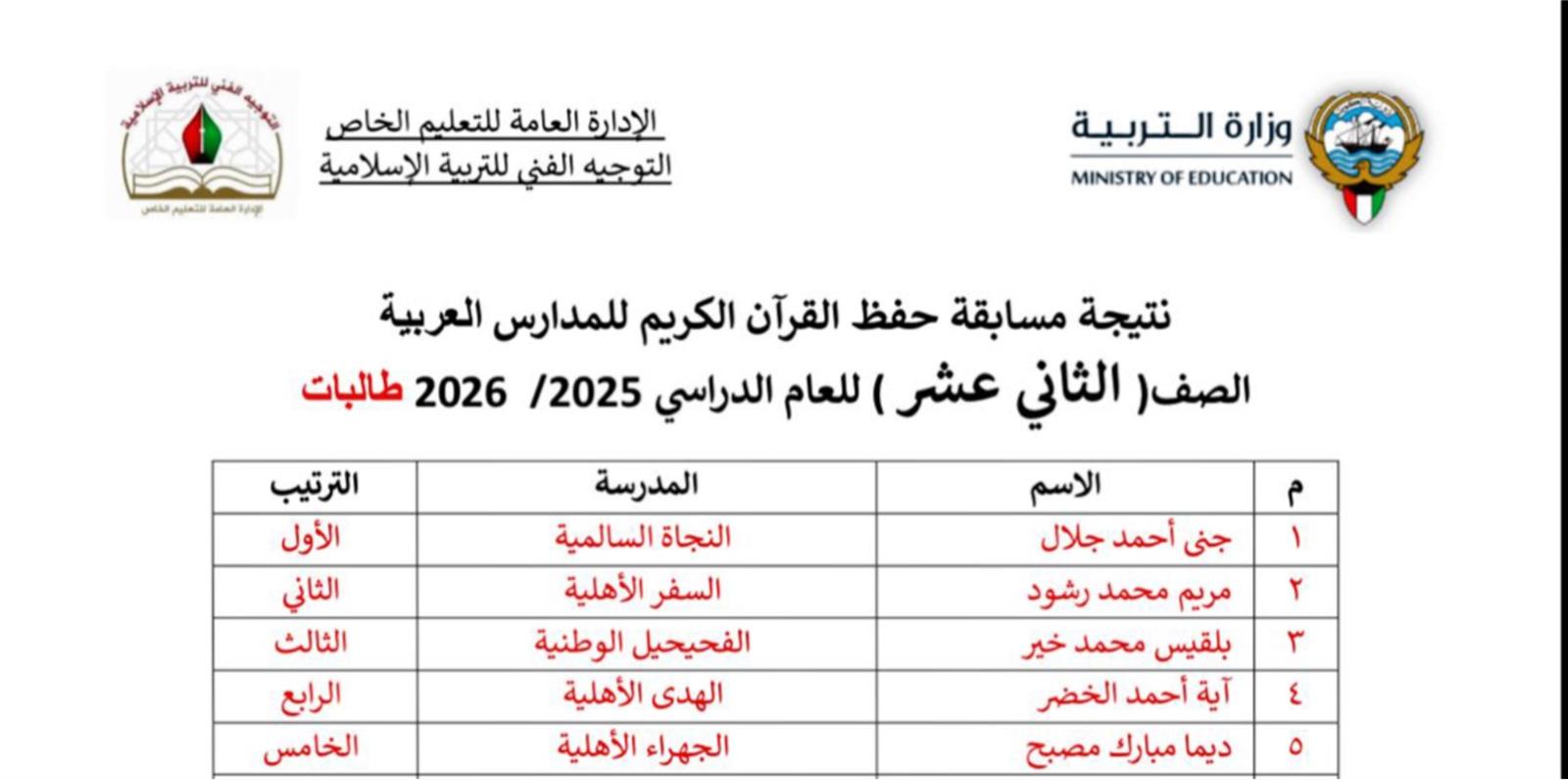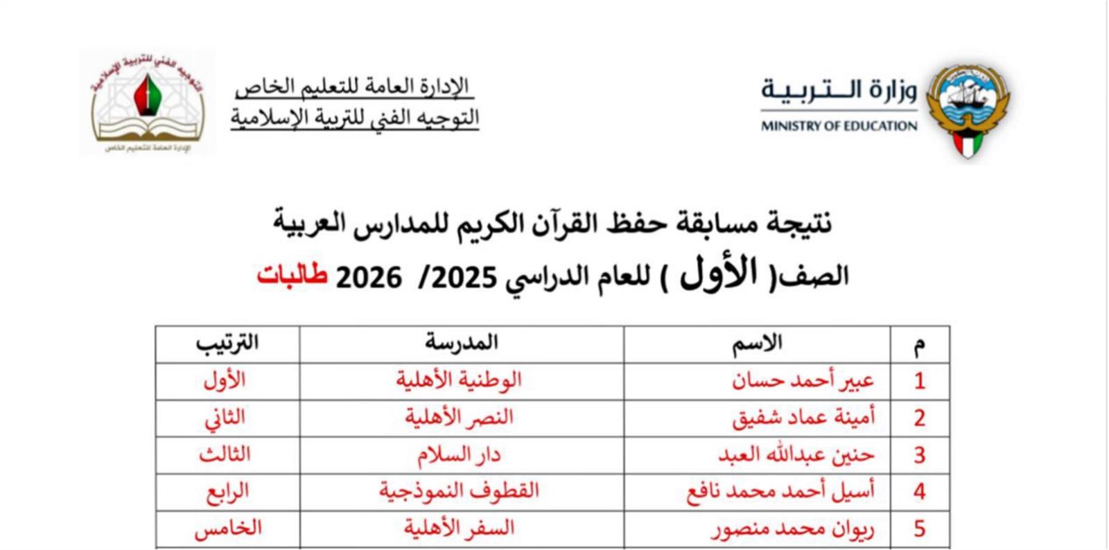 بكل فخر واعتزاز، نُعلن نتائج مسابقة حفظ القرآن الكريم للمدارس العربية للعام الدراسي 2025/2026، والتي أُقيمت بإشراف التوجيه الفني للتربية الإسلامية بوزارة التربية، وشملت طالبات الصفوف من الأول الابتدائي وحتى الثاني عشر.