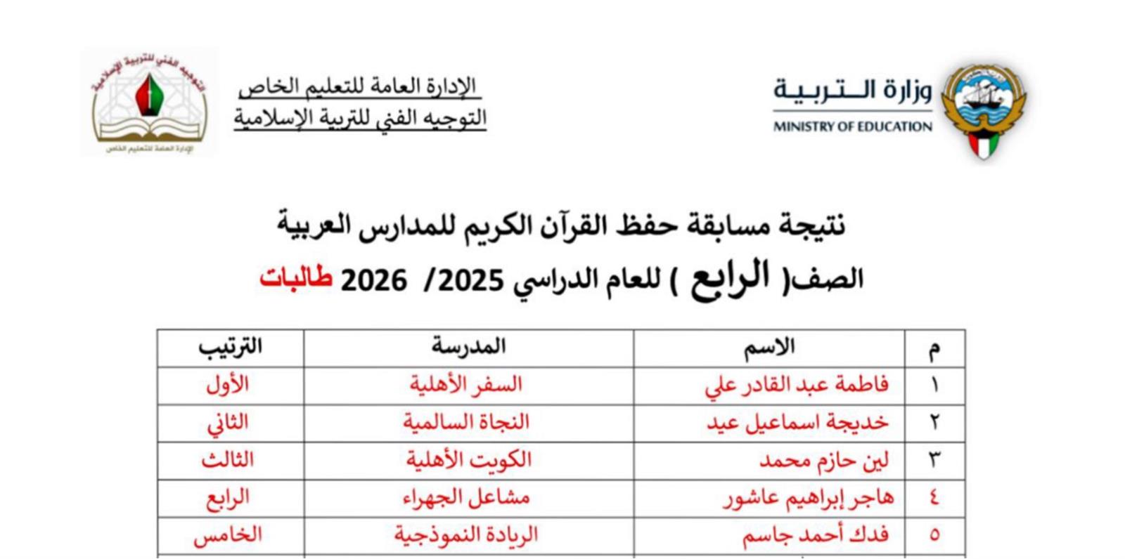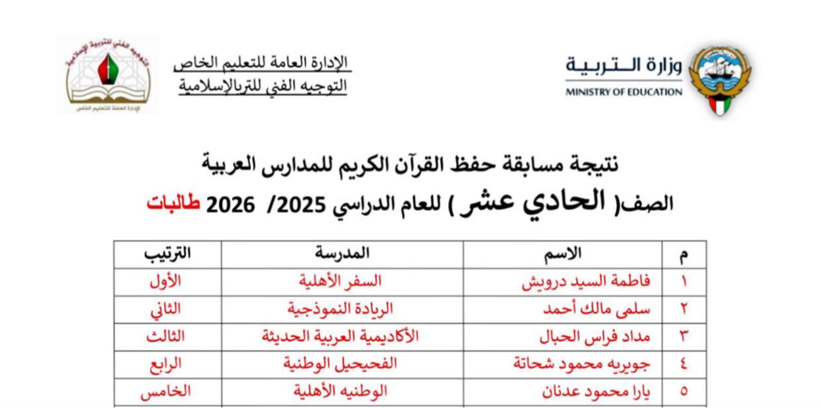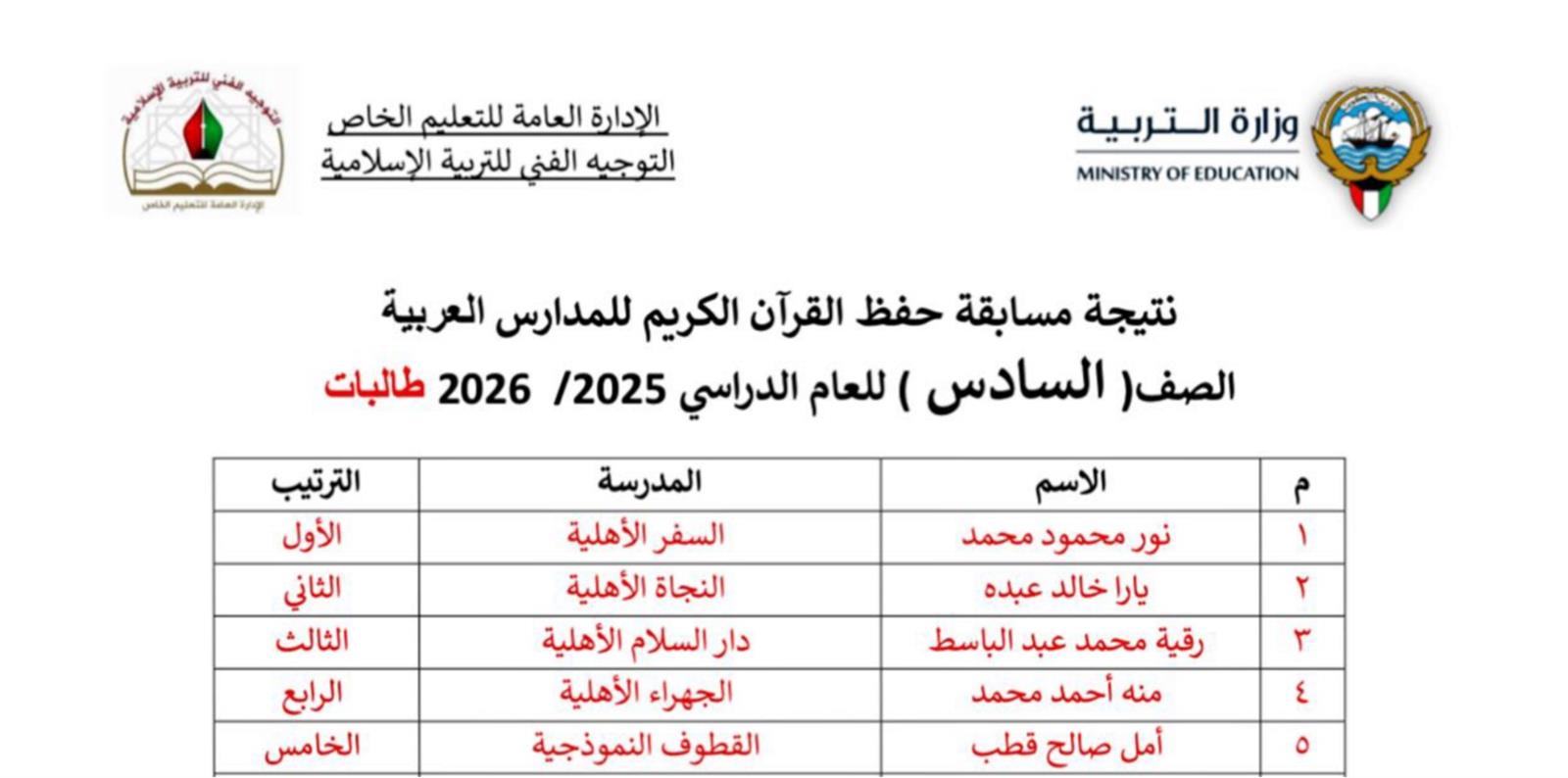 بكل فخر واعتزاز، نُعلن نتائج مسابقة حفظ القرآن الكريم للمدارس العربية للعام الدراسي 2025/2026، والتي أُقيمت بإشراف التوجيه الفني للتربية الإسلامية بوزارة التربية، وشملت طالبات الصفوف من الأول الابتدائي وحتى الثاني عشر.