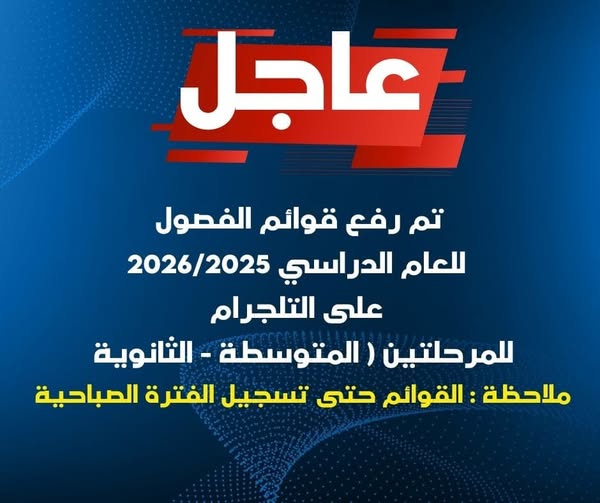 طالباتنا العزيزات نحيطكم علماً أنه تم رفع قوائم الفصول للعام الدراسي ٢٠٢٦/٢٠٢٥ وذلك على حساب المدرسة في التلجرام وذلك على الرابط التالي